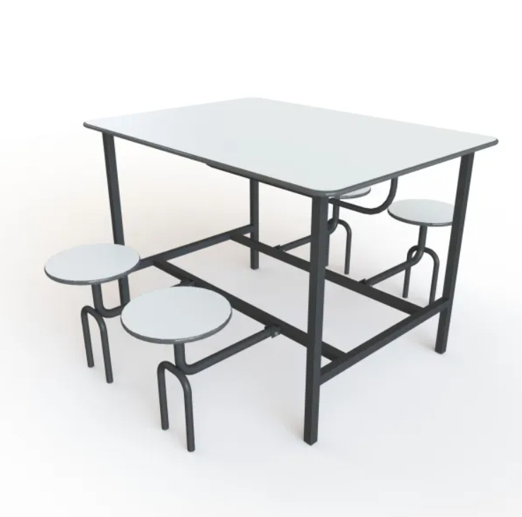 Possui bancos retráteis com assento redondo em MDP 15mm revestido em formica com borda em perfil T. Estrutura tratada com sistema anti ferruginoso e pintado com tinta epóxi a pó com secagem em estufa a 180°.
